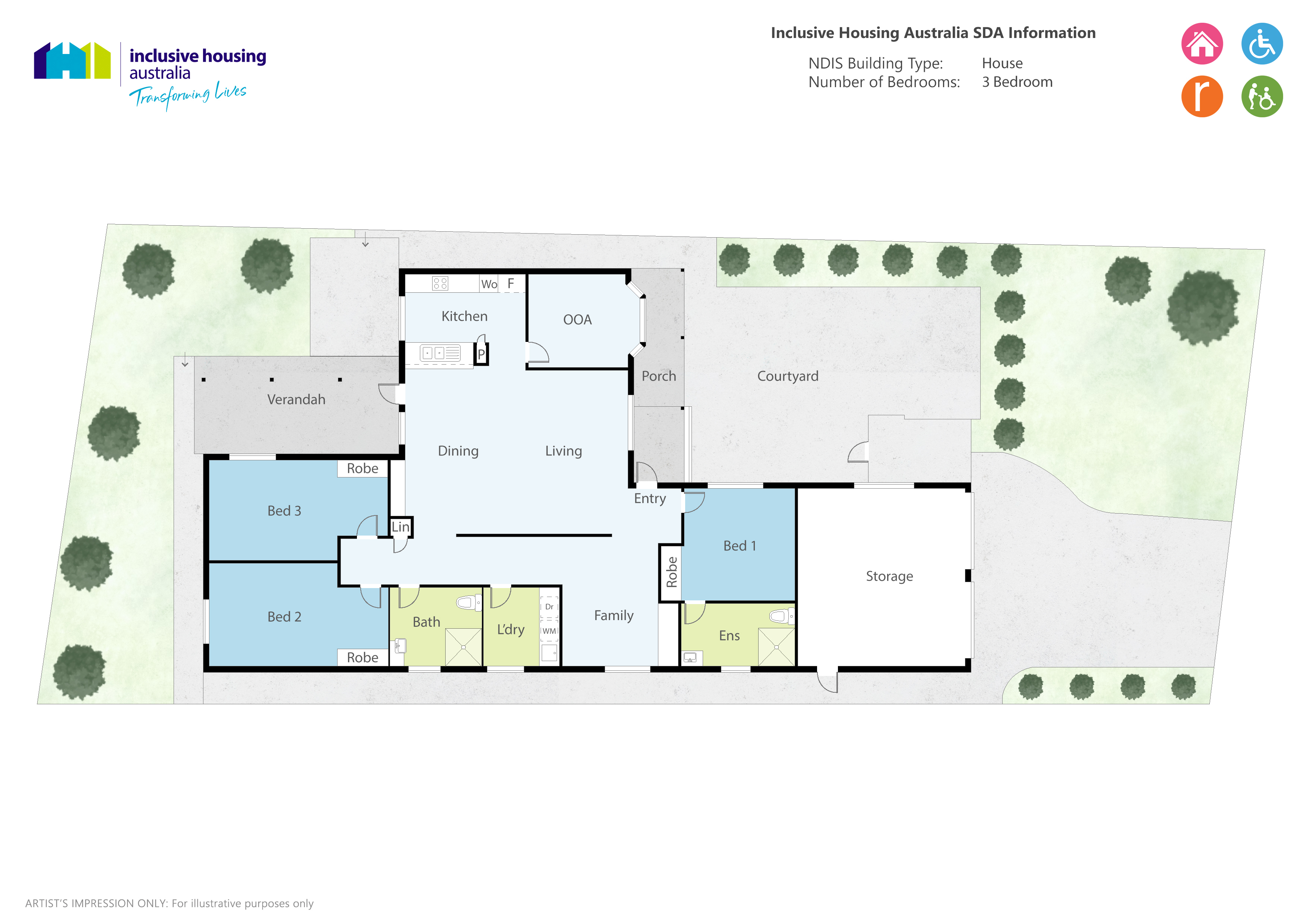 Currently undergoing a full renovation, this lovely home will provide accommodation of three High Physical Support bedrooms, one with ensuite, an OOA (Overnight Onsite Assistance) room with two living areas, and an established yard. From the moment you walk in the front court of this dwelling it feels like home.