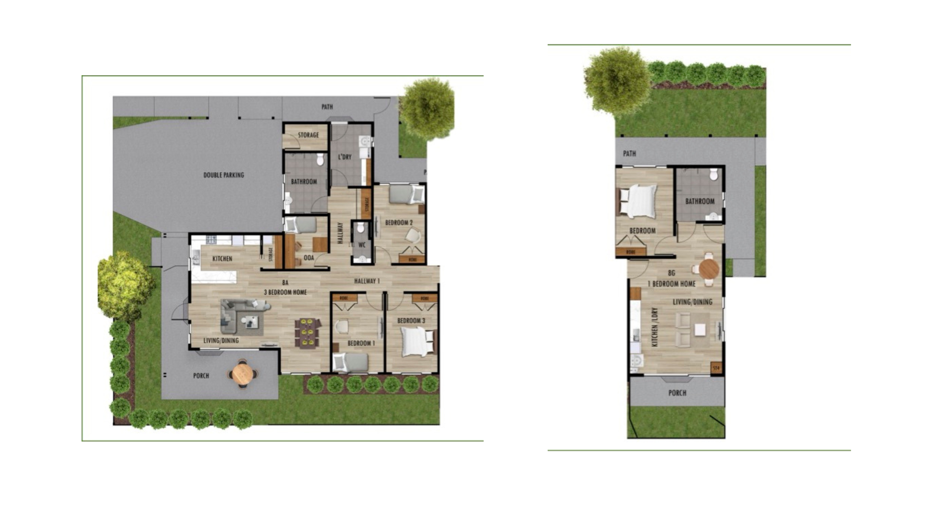 - Three-bedroom main home with shared accessible bathroom and separate toilet